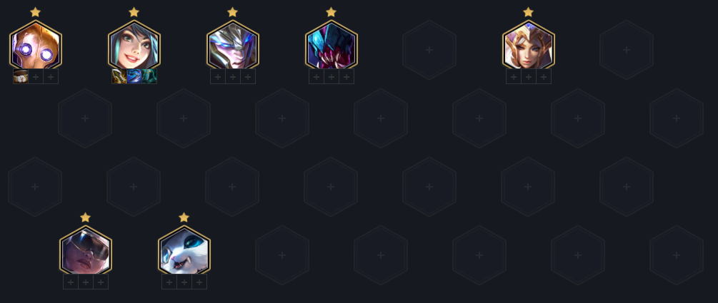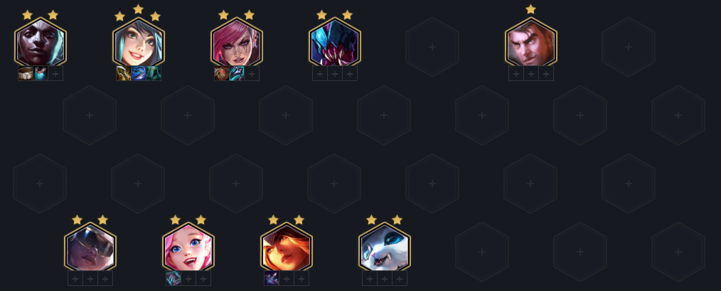 后续到了决赛圈升九,直接单挂五费牌,杰斯为后期主T,希尔科、塔姆都可以,注意站位让艾瑞莉娅尽量不要对位到对面最肉的前排,刀妹需要迅速解决(solve)掉第一个目标刷新技能收割。如果有强袭转给赛娜补皇子开6强袭,看情况也可以(yekeyi)开4执法,补足阵容成型后基本无敌。