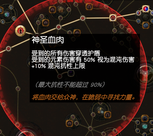 1,红色永恒珠宝提供的神圣血肉天赋,红色的永恒珠宝那个,用神圣洗出夏巴夸亚,可以插在如图插孔,最好(zuihao)还能洗出一个加1混沌抗性上限的大点,这个天赋下个赛季据说会出现在天赋里,可以节省一个插口