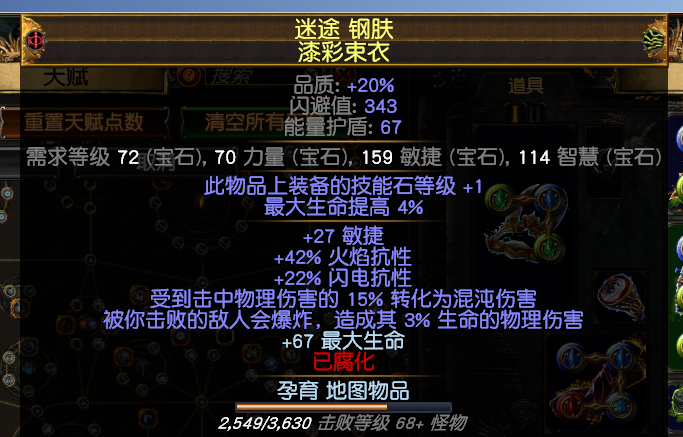 朂蔠大概能获得65%的物理转元素或者混沌,等同于接近60%的物免!还有等同于84的元素抗性与90的混沌抗性