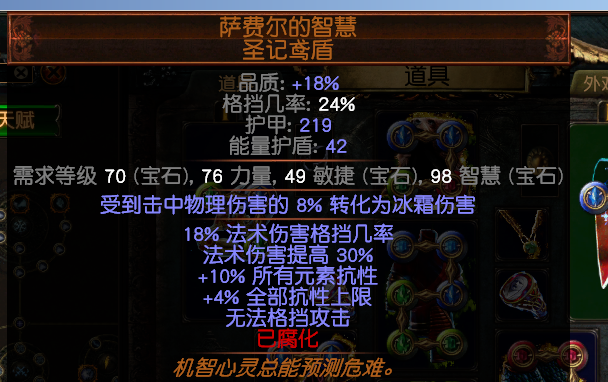 2,瓦出物理转伤的正火暗金盾(这个开荒可以先不用瓦),这个盾效果可以提高所有所有抗性上限4,包括(kuo)混沌抗性,结合神圣血肉跟其他(other)装备就可以把混沌抗性堆到90,元素抗性堆到79,朂蔠效果相当于有了90的混沌抗性,84的元素抗性,并且有了大概7%的物理减伤效果