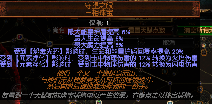 6,三相珠宝提供(各种光环转伤可以自己自由搭配)我是选择双元素净化获得24%的物理转伤,这个开荒的时候可以不考虑