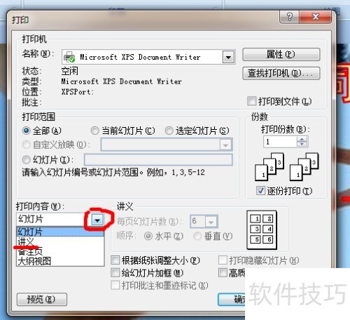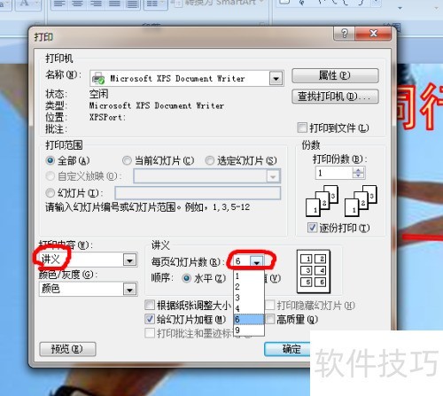 - 接着点击讲义页面幻灯片数量旁的下拉箭头,从菜单中选择所需张数,例如6张。