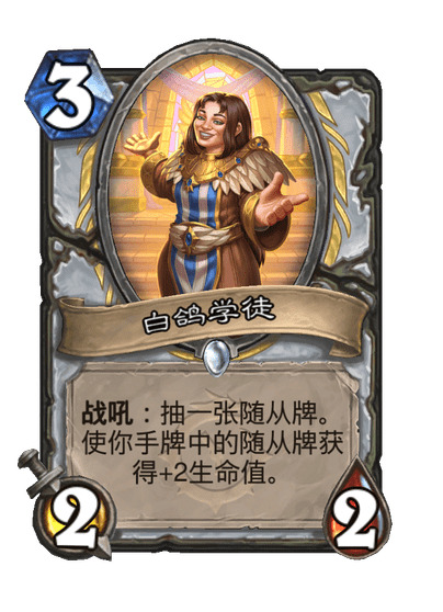 战吼:抽一张随从牌。使你手牌中的随从牌获得+2生命值。