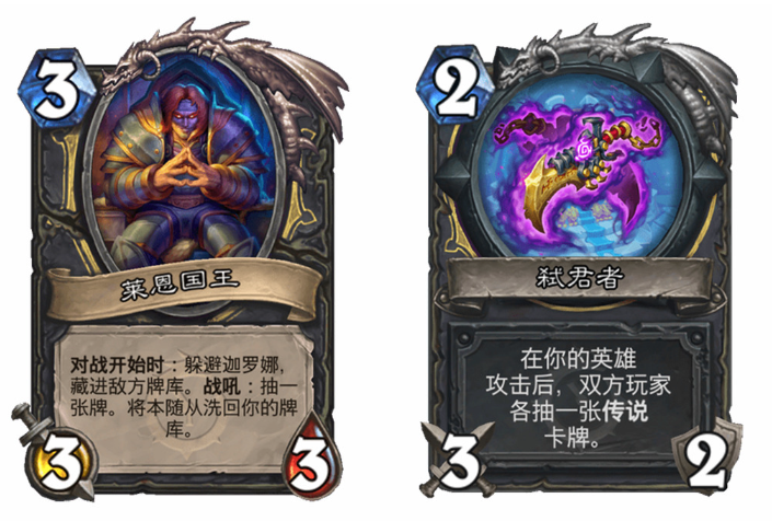 奇闻。战吼:如果莱恩国王在对手手牌中,将其摧毁并将敌方英雄的生命值砍半。