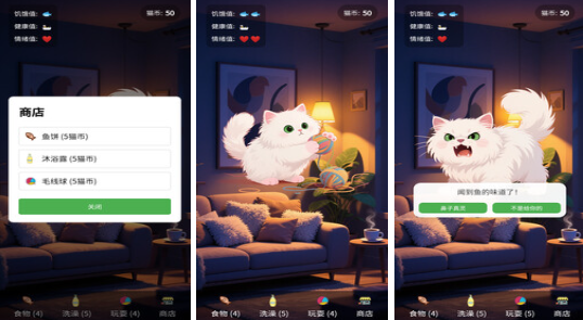 在这个游戏中,你会有一只毛绒柔软、犹如棉花糖般温润的小猫咪。它会成为你生活中的小宠儿,陪伴在你的左右,为你打扫卫生、梳理毛发。你可以跟它一起玩耍,甚至可以举办迷你运动会,让它展示它的敏捷和灵活性。除此之外,游戏还提供了多种小游戏供你挑战。每当与猫互动时,你的亲密值会得到提升,而猫也会因为这些互动变得愈发亲昵可爱。游戏中,你会听到猫咪的清脆叫声,仿佛是大自然中最温柔的声音,这不仅会让小猫的外表变得更加逗趣可爱,更会在心灵深处带来治愈的效果,让你的心灵在这一刻完全放松和宁静下来。