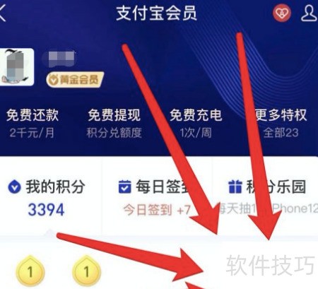 进入我的页面,点击支付宝会员,通过签到和完成任务获取每日积分。