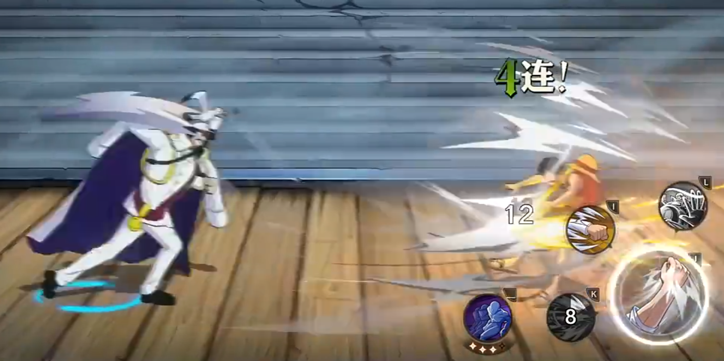 在战国战场中,当敌人使用海军援助时,动技能“敬礼”并不会直接攻击,而是先进行敬礼动作。当满奥义点达到一定值时,该技能可升级为“大佛”子技能,所有技能将不再有冷却时间,并且技能生成迅速的佛影冲击效果。
