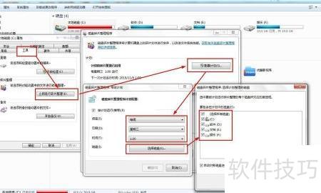 8、 右键点击磁盘,选择属性,进入工具选项,启动碎片整理,设定计划任务,勾选定期执行,随后配置整理频率、时间及目标磁盘,完成自动碎片整理设置。