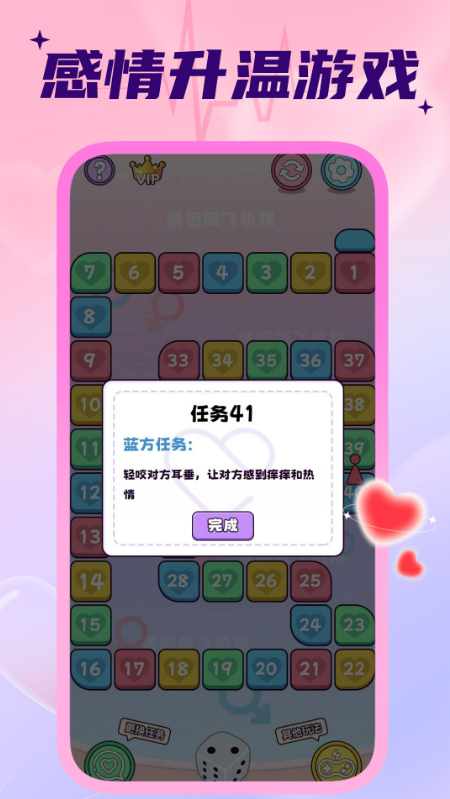 专为恋爱中的用户打造的沉浸式互动游戏,融合了丰富的情感元素和策略挑战。每个格子上设有增进感情的小任务,玩家通过投掷骰子推动棋子前进,完成相应挑战。游戏中提供多种辅助道具,帮助你干扰对手或保护自己。击败对方棋子即可赢得胜利,同时加深双方情感的连接。此外,这款游戏还支持邀请特定对象共同游戏,以此促进亲密关系的发展。