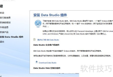 如图所示,DB据库的安装与启动页面包含Data Studio插件的选择项,但其需要用户手动下载和安装。