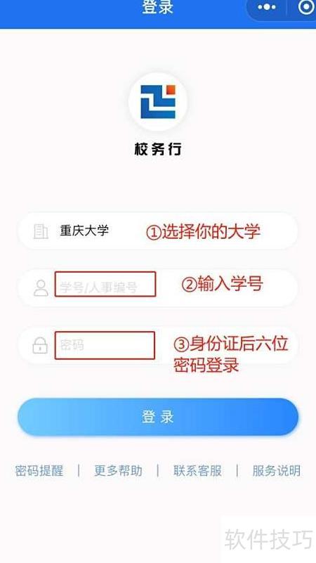 - 选择所在学校,输入学号及密码(通常为身份证后六位)登录系统。