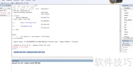 执行命令 `winsor 变量名, replace cuts( 后,系统会先计算变量在 和 分位点上的数值。例如,以变量 `ac 为例,其 分位数为 `a` 而 分位数为 `b`,那么所有值小于 `a` 的将被替换为 `a`,大于 `b` 的则替换为 `b`。原始数据直接更新为处理后的结果,这一过程称为缩尾处理,能够有效平滑极端值,缩小异常数据的影响范围,并设定标准为两端各 。若在命令末尾增加 `trim` 选项,则不进行替换操作而是直接删除低于 分位数和高于 分位数的观测值,实现对极端值的有效剔除。