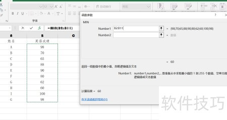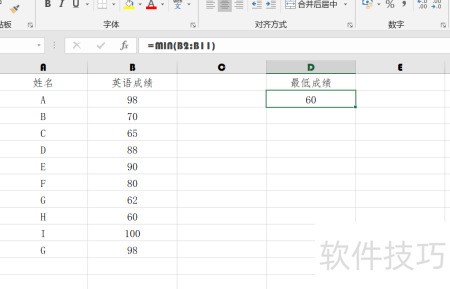 - 在工作表中完成上述操作后,B列成绩的最低分即被计算出来,并显示在D2单元格中。