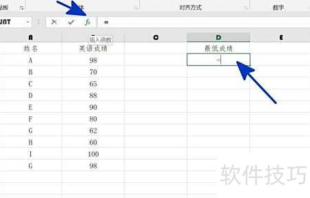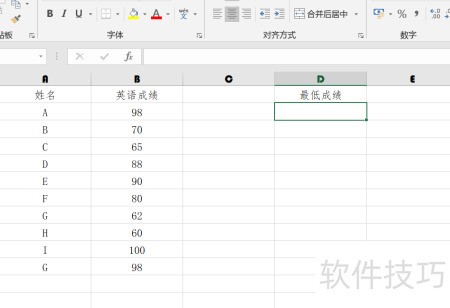 - 统计B列学生成绩的最低分,并将结果展示在D2单元格中。