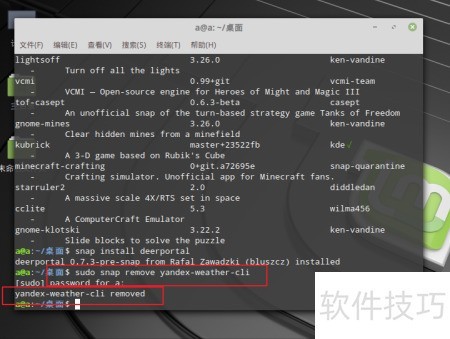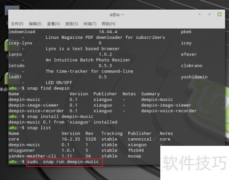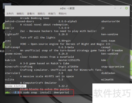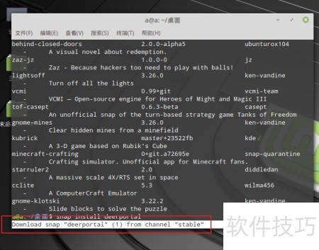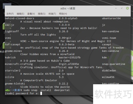 - 输入密码后安装软件,通过命令sudo snap find +软件名搜索所需的应用或游戏名称即可查找。