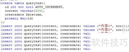 创建名为querytest的数据表,请参考以下结构,完成后可插入若干测试数据以进行初步验证。当前阶段仅需这些数据来进行简单测试。使用命令`use`可以切换到指定的数据库(例如:`use test`表示切换至名为test的数据库,并在该数据库上执行后续建表操作)。