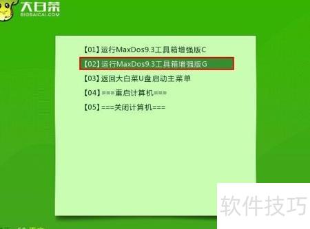 1、 插入U盘启动后进入大白菜主界面,选择运行MaxDos工具箱增强版菜单,按回车键确认执行。