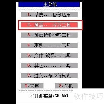 - 进入主菜单后,用方向键选择2.硬盘......分区工具,按回车键确认操作。