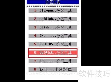 - 进入分区工具选项界面,用方向键选择6.Spfdisk...分区工具,按回车键确认执行。