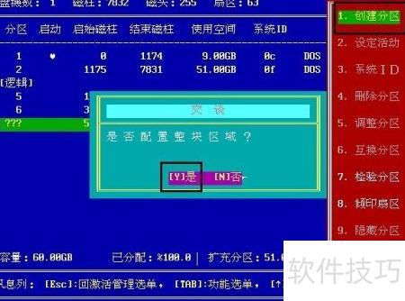 - 在功能选项中选择1.创建分区,按回车确认后输入Y,选择是以开始创建分区。