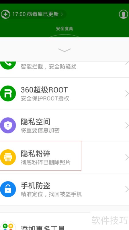 - 安装360手机卫士后,进入主页上滑即可找到隐私粉碎功能。