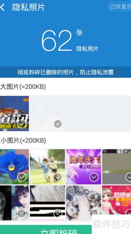 - 开始扫描,天哪,数量真多!照片竟有62项,短信不是刚删过吗?