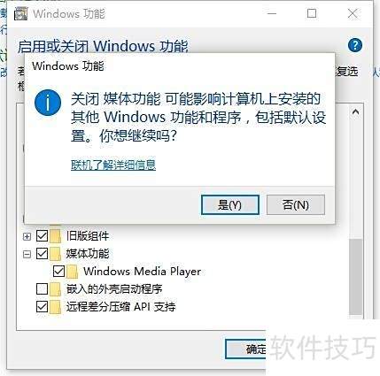 - 取消勾选Windows Media Player前的复选框,系统会提示是否确认更改,点击是即可完成操作。