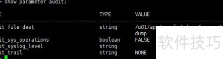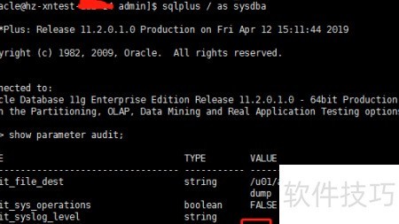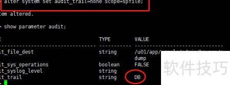 执行show parameter audit命令可查看审计日志配置,如audit_trail设为DB,表明审计功能已开启,数据将写入名为AUD$的表中。