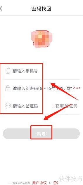 - 进入密码找回页面,填写手机号、新密码和验证码后,点击确定即可。