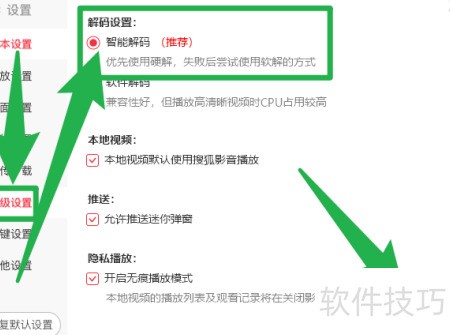 - 进入高级选项,定位解码配置,启用智能解码功能后保存设置。
