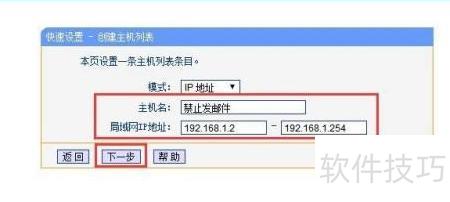 请参照以下步骤进行操作:首先打开指定界面后,选择快速设置;在主机名和局域网IP地址栏中输入禁止发邮件和相应的子网掩码,如之后点击下一步完成设置。