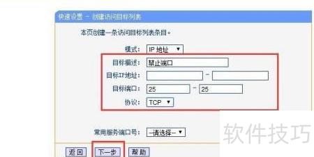 接下来,请输入相关细节:在此处指定目标描述,无需填写;目标的IP地址保持为空白;将目标端口号设定为间,并在协议类型中选择TCP,之后按步骤完成后续操作。