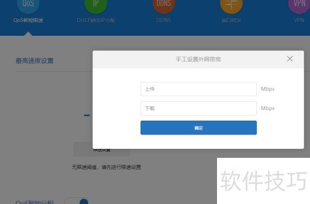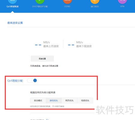 转到服务质量(QoS)设置页面,激活QoS智能速率控制选项,根据你的需要选择是游戏、视频还是网页,并自动调节网络带宽以增强特定情况的上网效率。