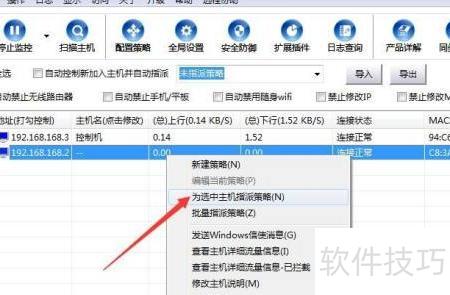 开启监控功能后,系统将自动识别并展示局域网内的所有联网设备,然后只需挑选需要管理的计算机,并通过右键菜单设定具体策略以实施相应的管理和控制措施。
