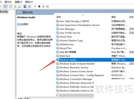 - 在右侧窗口中定位Windows Audio服务,双击该服务项以打开其设置界面。
