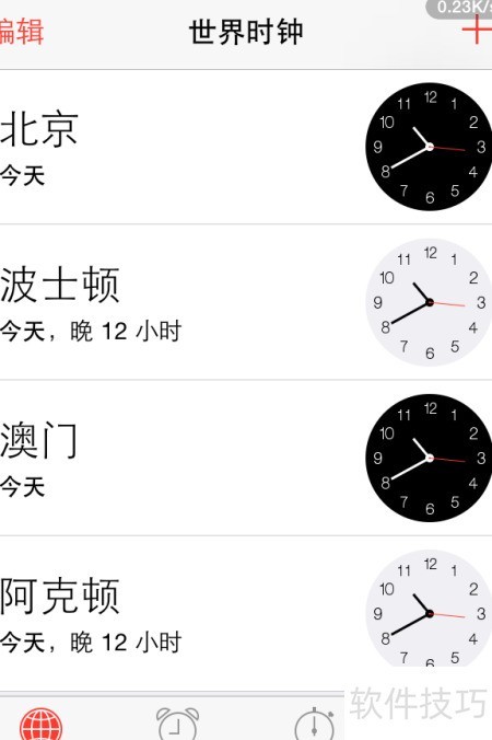 - 点击右上角加号,可添加全球各地时钟。