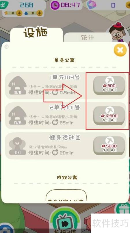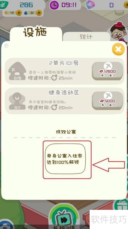 - 单身公寓入住率达100%后,点击即可解锁二期建设。