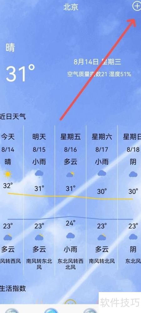 - 进入城市天气页面后,点击右上角的加号图标。