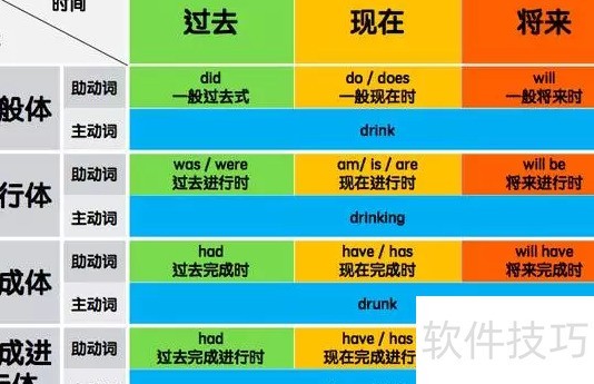 横观表格,每个动词形式对应过去、现在和将来三种时间,形成十二种时态。