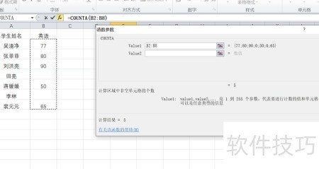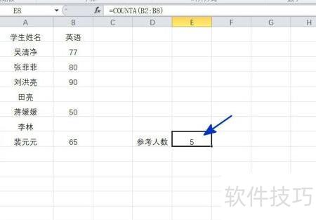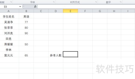 - 根据表格B列英语成绩统计参考学生人数,结果在E8单元格中显示。