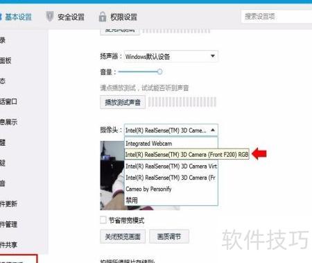 登录QQ系统,点击音频和视频通话选项,预览画面后,切换摄像头到Intel(R) RealSense(TM) Camera (Front F RGB,确保设备识别无误,关闭预览,完成摄像头配置。