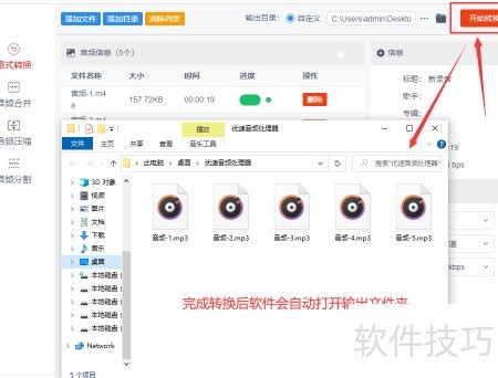 完成操作后,点击右上角的按钮,启动格式转换。转换单个m文件后,软件将自动打开输出文件夹,转换后的mp件保存于此。