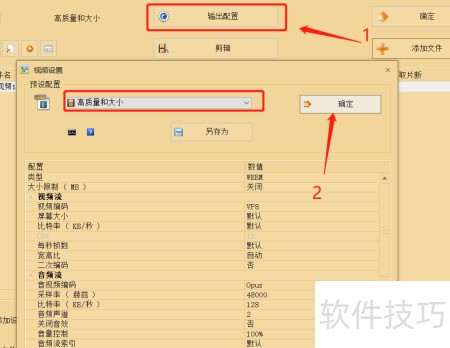 - 在WebM转换设置中,点击输出配置,按需调整文件质量、编码等参数。