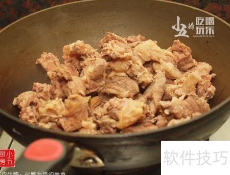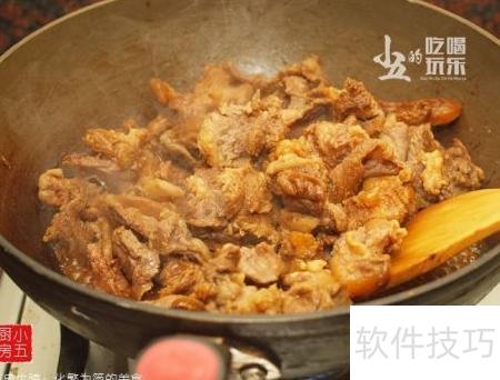 - 加入生抽和白糖炒至牛腩变色后关火。