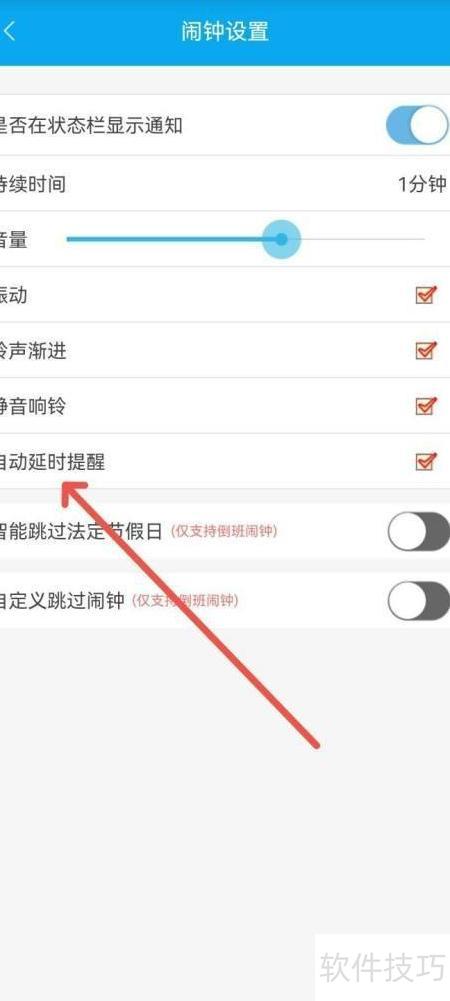 - 进入闹钟设置,开启自动延时提醒功能,倒班超时即可自动获得提醒。