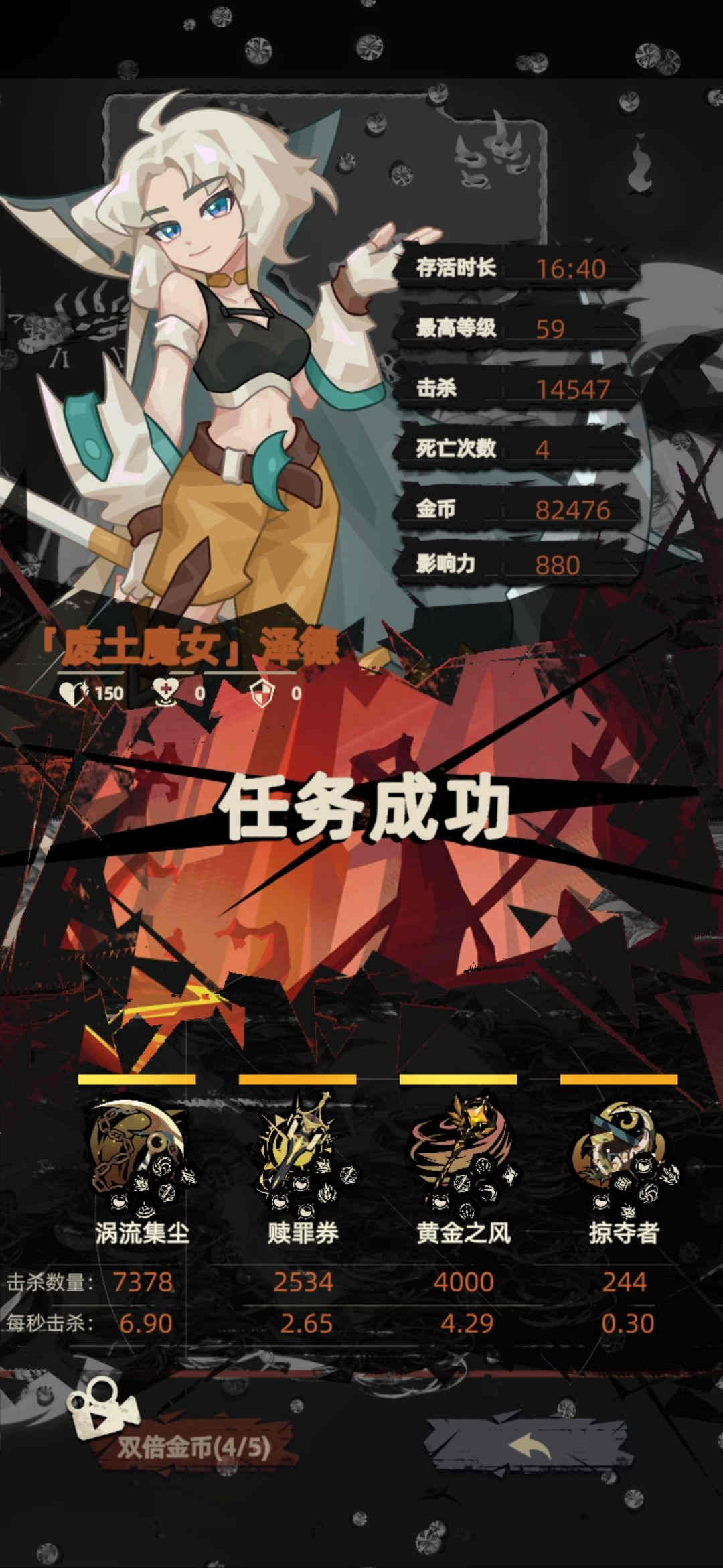 本搭配打boss有点慢,不过还是用复活耗死。配置不够刷普通图,配置够了直接刷梦魇图,一局8万不是梦(见图)