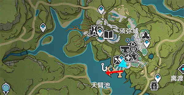 3:第三个位置在须弥主城这里,天臂池附近,这里有四个鱼类;