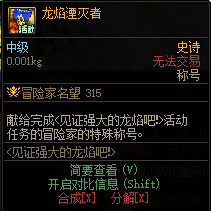 DNF龙焰湮灭者称号获得方法参加巴卡尔挑战活动:见证强大的龙焰吧,在12号~21号6点前通关可获得龙焰湮灭者称号。