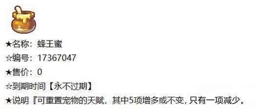 - 蜂王浆可以重置宠物的天赋,而且其中五项增加或者不变,一项减少。