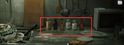 2、使用刀片划破镜子旁绷带,得到电池,放置到娃娃上面,看见字母,厨房水池旁边调料瓶按照字母排列。